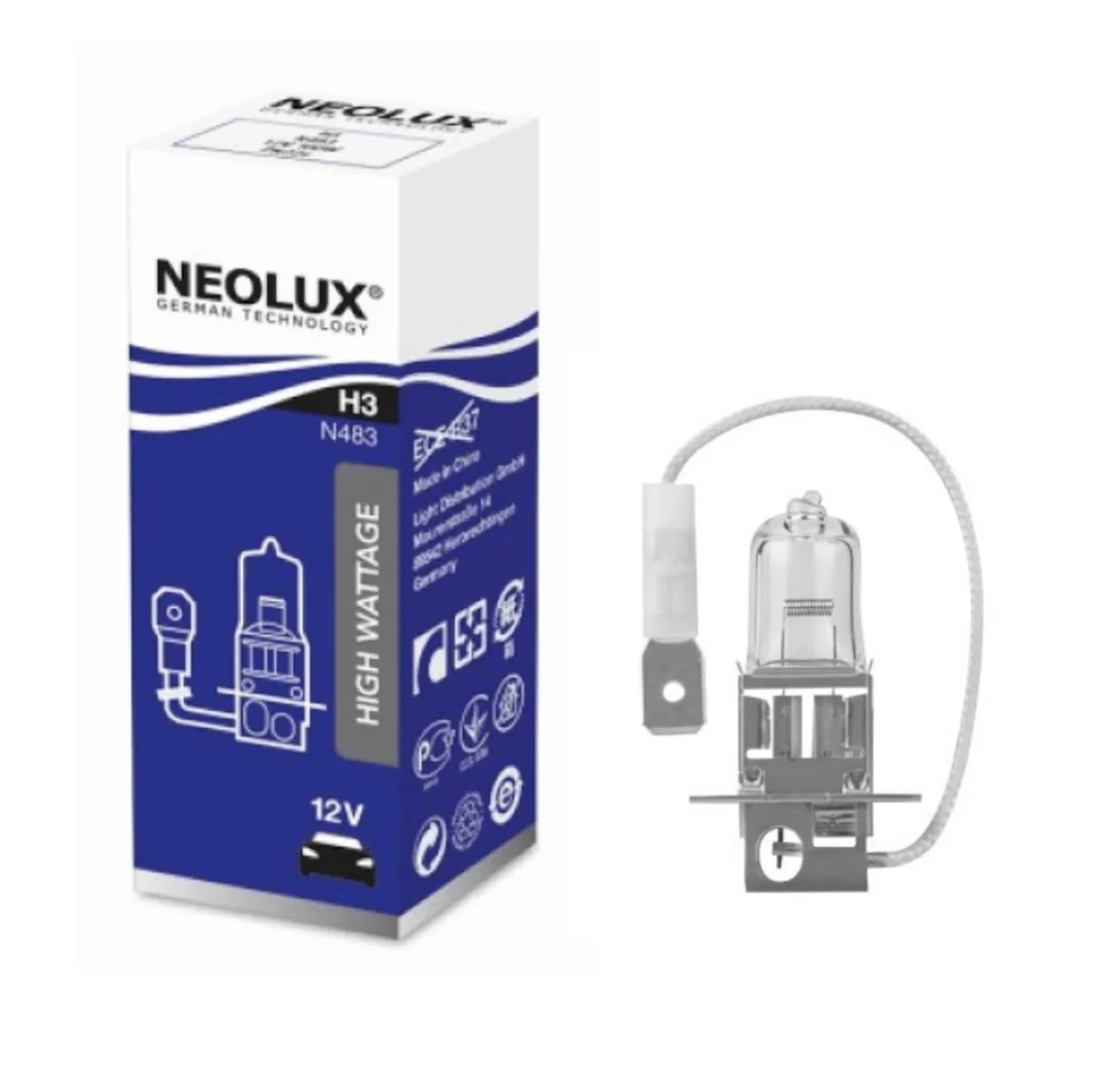 The N483 100W 12V halogen bulb from NEOLUX is a H3 halogen bulb for cars. Good and clear visibility for your car with the increased power of the N483 H3 halogen bulb from Neolux.